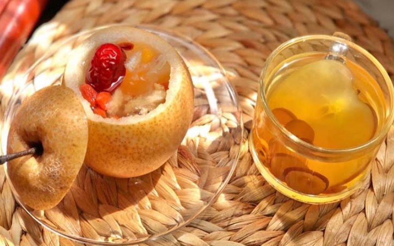 Lê có tính mát nên hỗ trợ giúp thanh nhiệt và làm dịu niêm mạc cổ họng. Khi kết hợp với đường phèn có tác dụng hỗ trợ làm dịu cơn ho, bổ phổi nên món ăn này trở thành phương pháp tự nhiên để hỗ trợ giảm ho đờm. Bạn có thể chưng lê với một ít gừng hoặc kỷ tử để tăng thêm hiệu quả hỗ trợ trị ho.