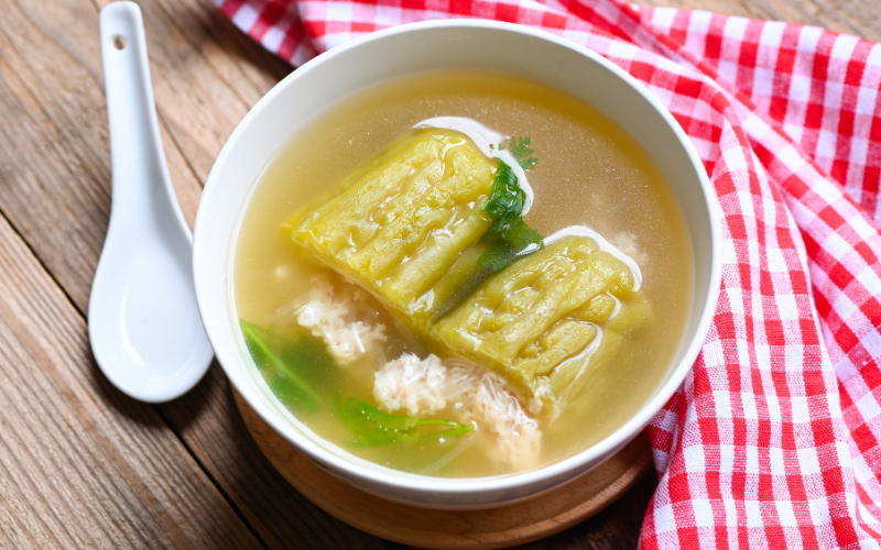 Mướp đắng là thực phẩm có đặc tính thanh nhiệt, giải độc, giúp hỗ trợ làm sạch đường hô hấp và tiêu đờm hiệu quả. Khi kết hợp với thịt băm giàu dinh dưỡng, món canh này không chỉ giúp bồi bổ cơ thể mà còn hỗ trợ giảm viêm nhiễm ở cổ họng. Có thể thêm nấm mèo hoặc hành lá để tăng thêm công dụng và hương vị.